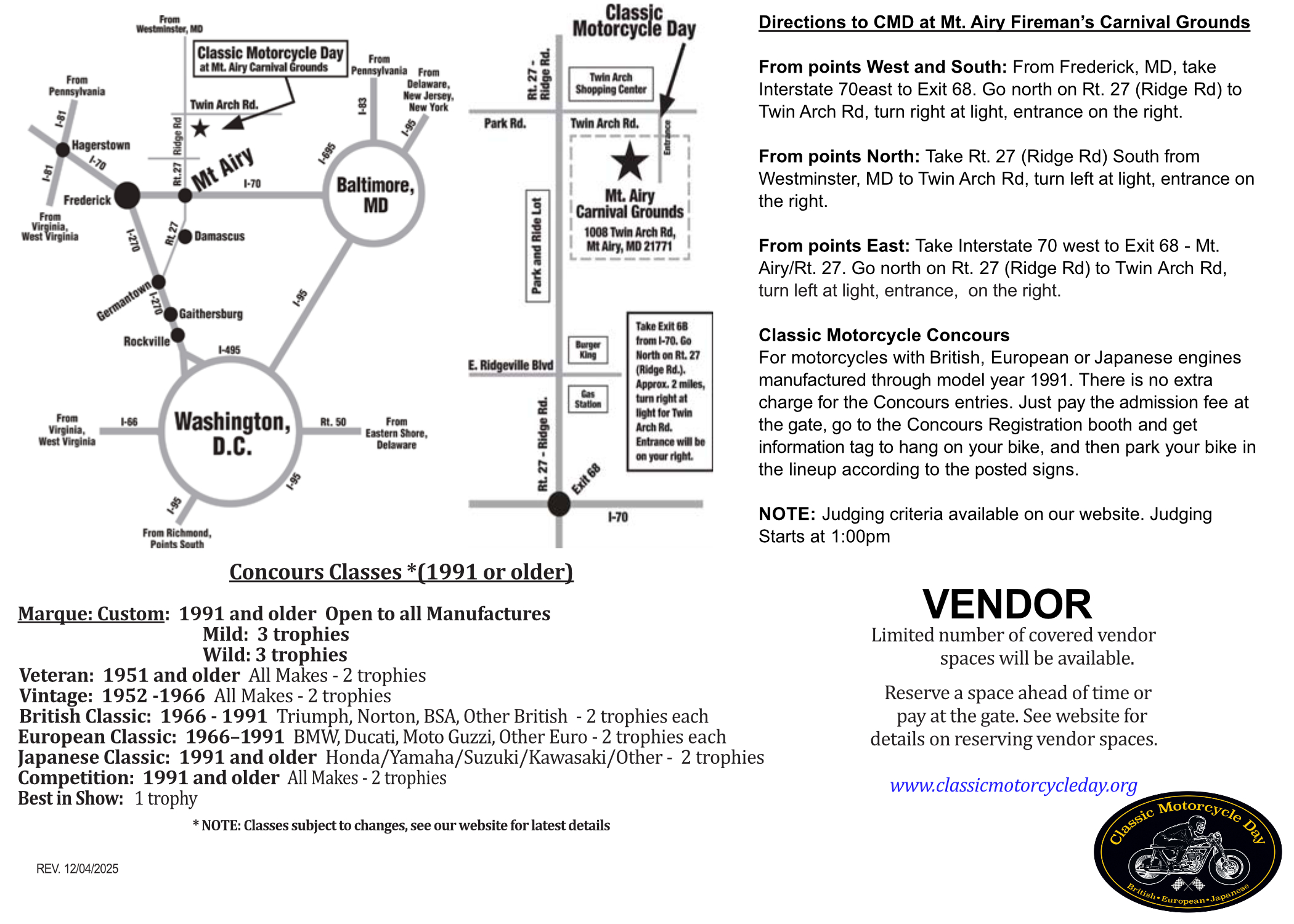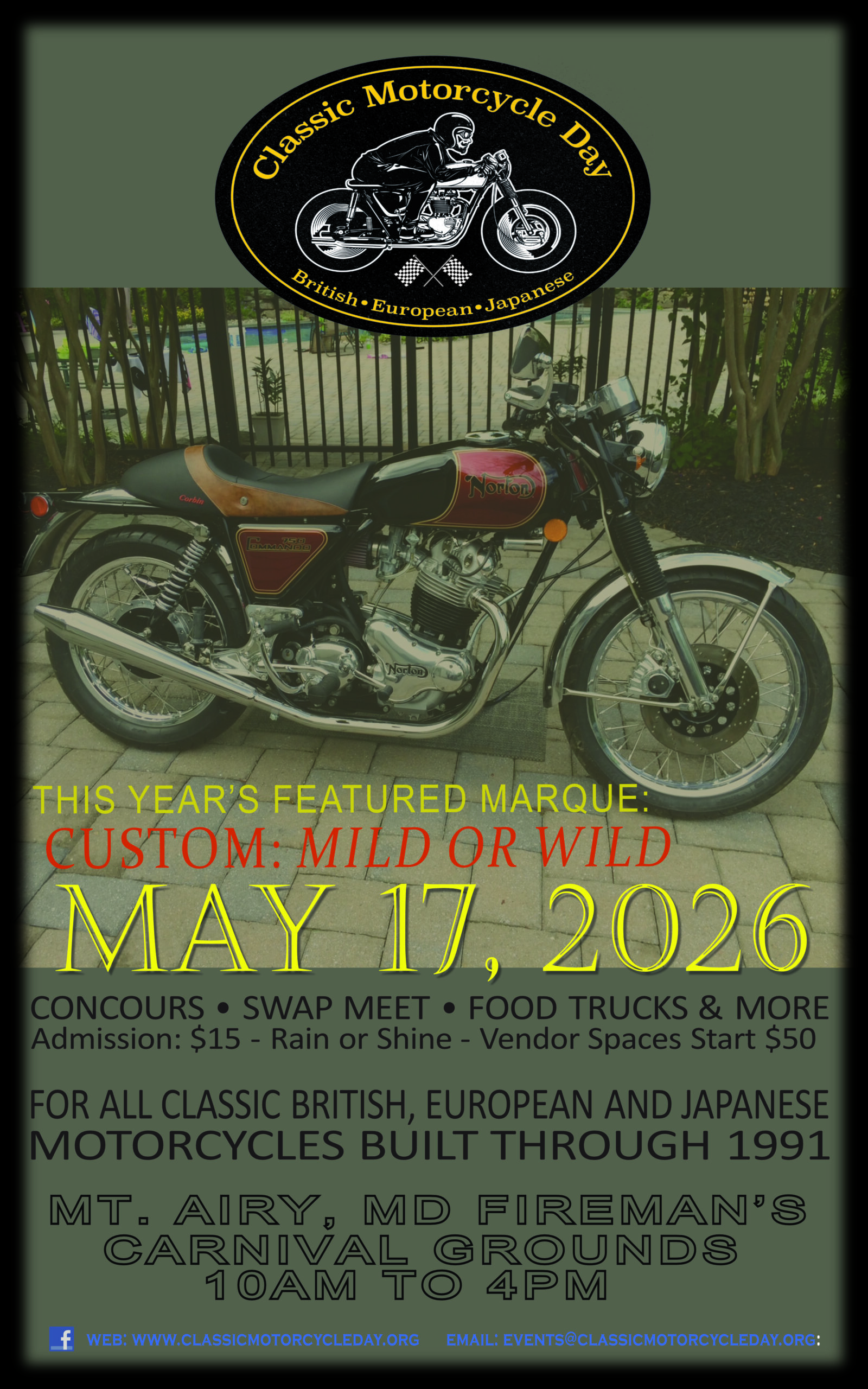 Classic Motorcycle Day is a one-day show and swap meet showcasing British, European and Japanese classic motorcycles 1991 and older. The judged concours show gives out over +30 awards and the large swap meet area is for buying & selling parts and accessories specifically for these classic machines.